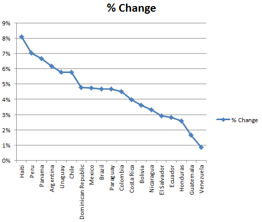 Following on graphical representations of how a select subset of Latin American nations rank in terms of per capita incomes, the following chart represents the percentage change of per capita income year on year from 2010 to 2011*: