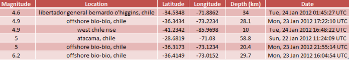 Between January the 22nd, and the 24th, Chile was shaken by 6 earthquakes of 4.0 or higher on the Richter scale.