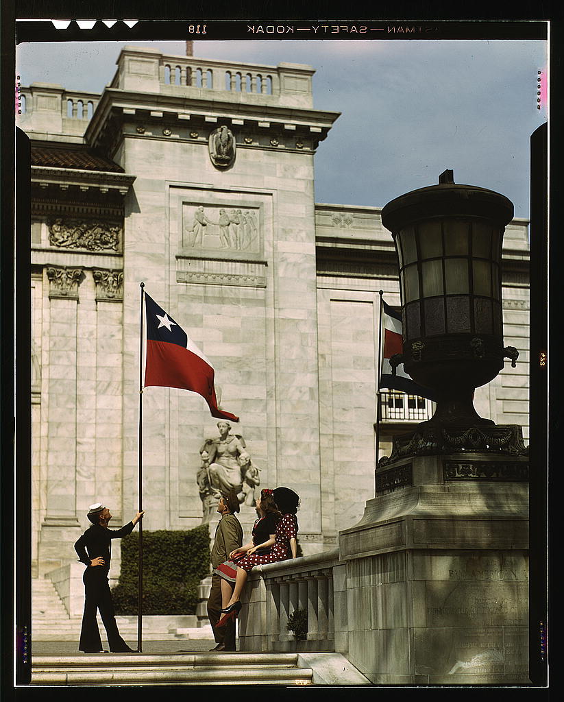 From the United States Library of Congress, this image shows a Chilean flag flying in front of the Pan American Building in Washington DC on May of 1943.