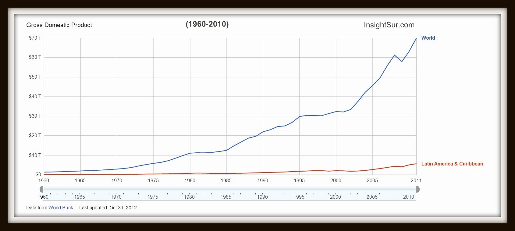 Latin American GDP vs. the World InsightSur / February 4, 2013 According to public data from the Worldbank, total combined GDP for Latin America & the Caribbean grew from $78.5 billion in 1960, to $5.65 trillion in 2011 representing an increase from just 5.82% of global GDP in 1960, to 8.07% in 2011. Share:Tweet Click to share on Reddit (Opens in new window) Reddit More Click to share on WhatsApp (Opens in new window) WhatsApp Click to email a link to a friend (Opens in new window) Email Share on Tumblr Click to print (Opens in new window) Print Like Loading...